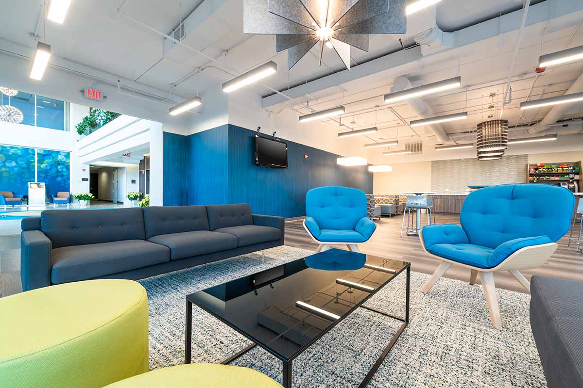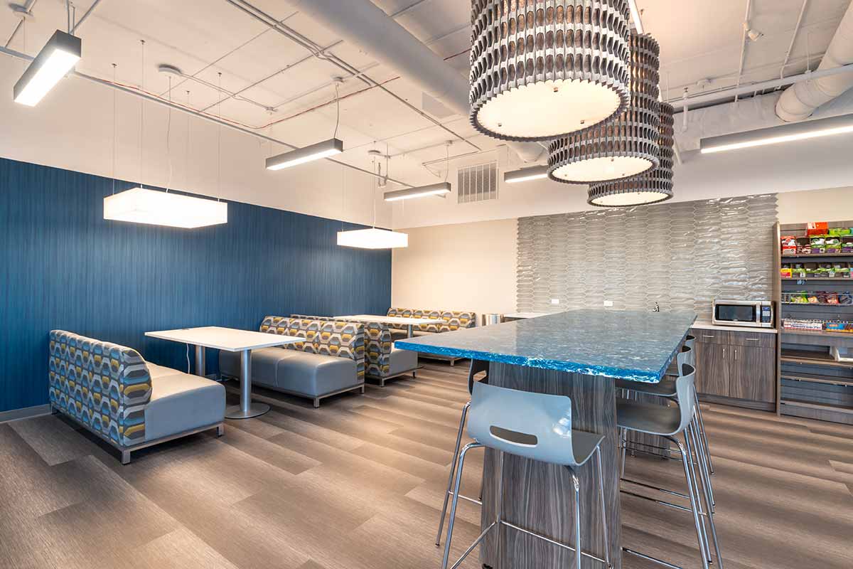 As part of an upgrade to an existing multi-tenant office building in Schaumburg, IL, Interwork was asked by the property owner to develop an amenity space consisting of a wi-fi lounge with relaxed seating areas, combined with mini-market/dining space for tenants to buy or prepare their own food, along with and dine in a comfortable, relaxed, yet stimulating atmosphere. In addition, a new conference center was included with various sized rooms to accommodate tenant’s needs.