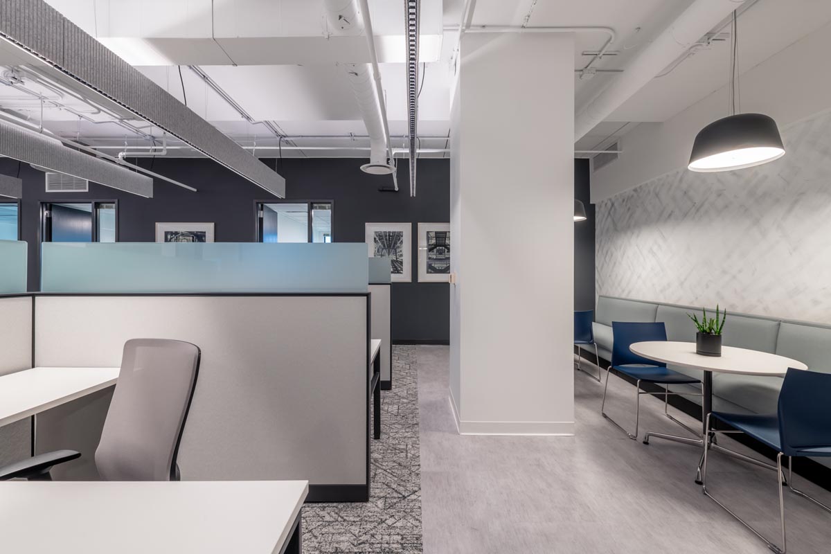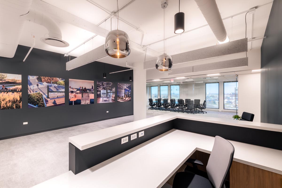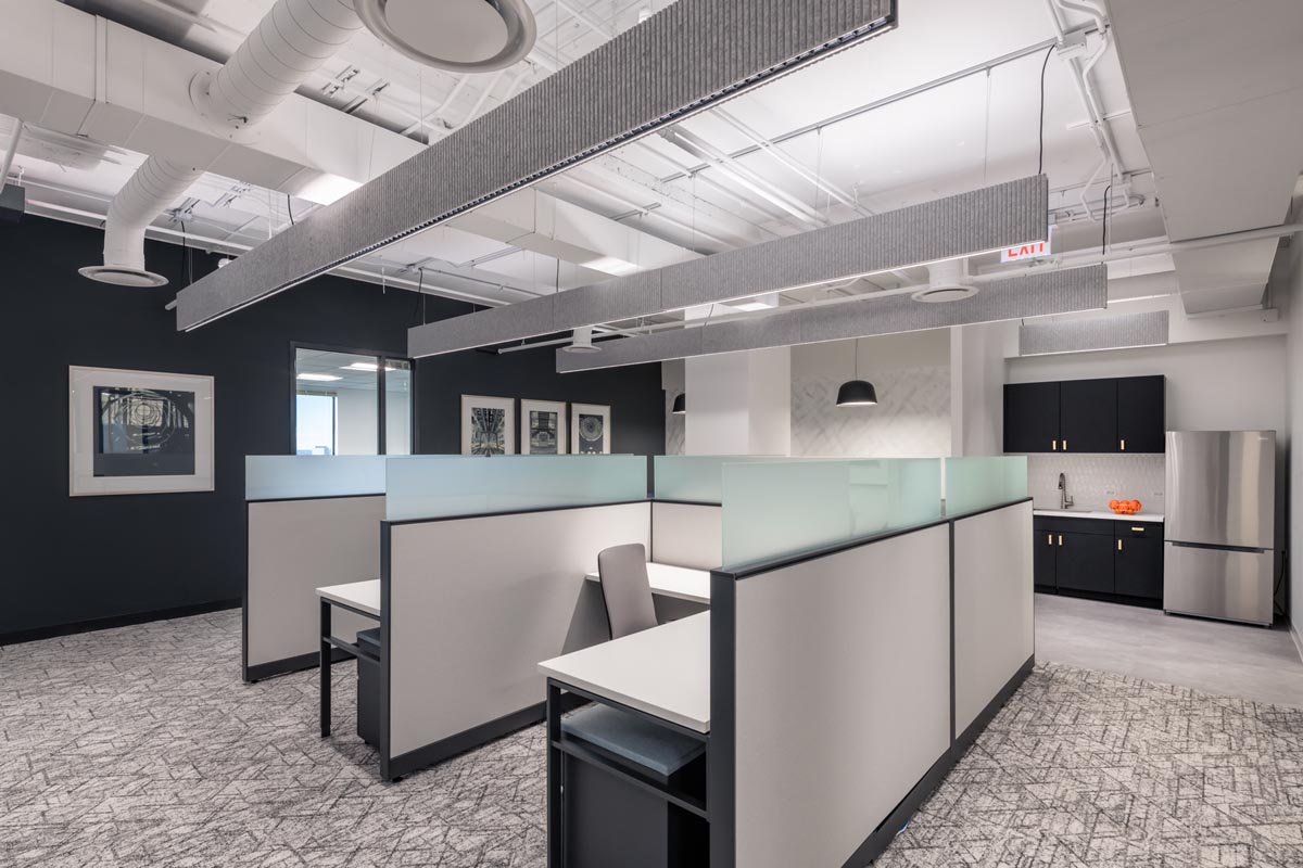 Newly renovated and fully furnished, Interwork recently completed two spec suites at Continental Towers in Rolling Meadows. The renovation was focused on providing an open loft like space with open to deck ceilings, bringing in more natural light. Modern neutrals and warm wood tones mixed with matte black accents provide these suites with a fresh and adaptable backdrop for any company to move into.