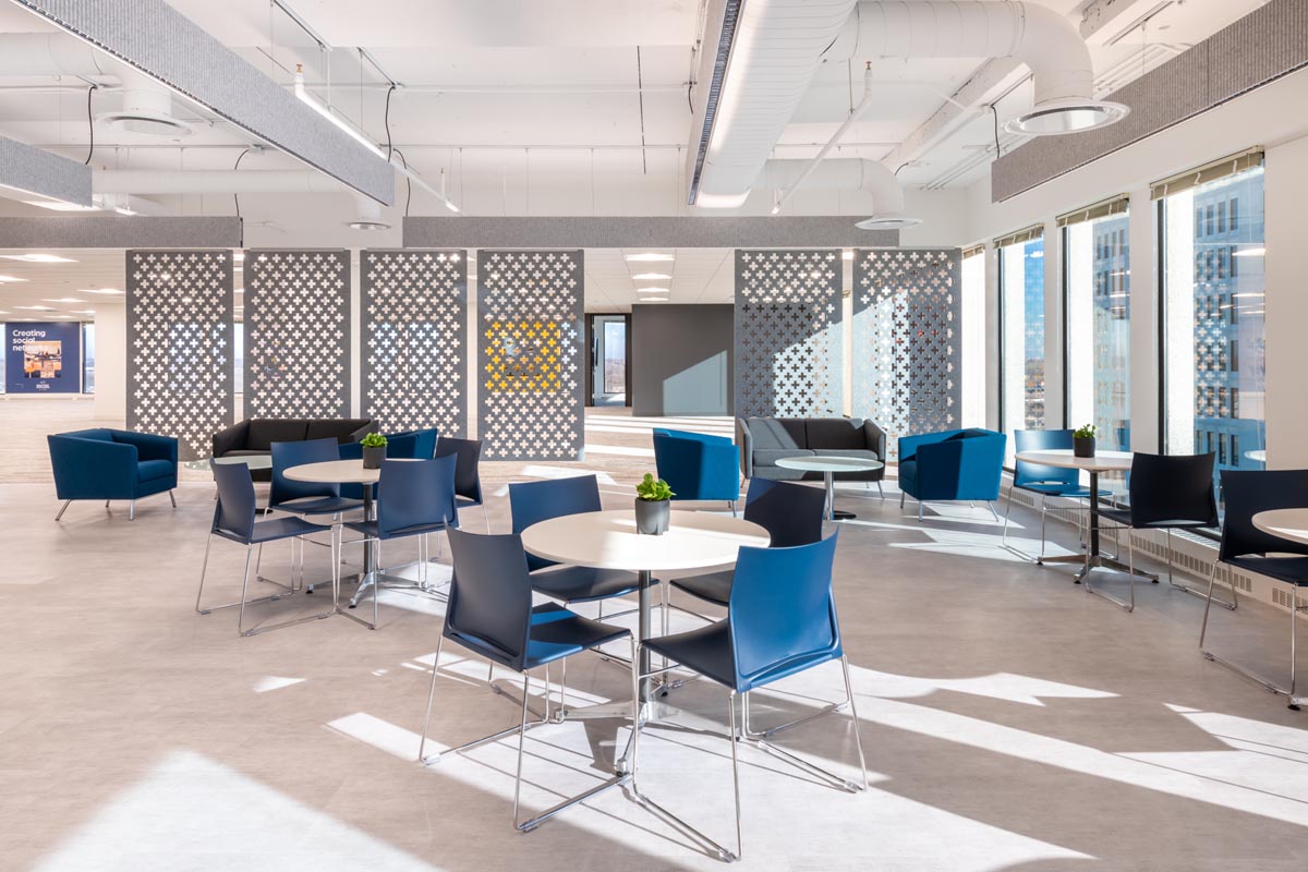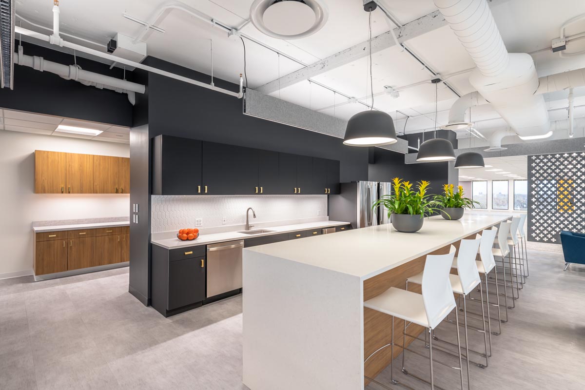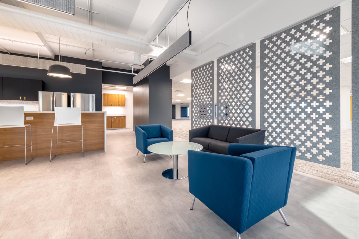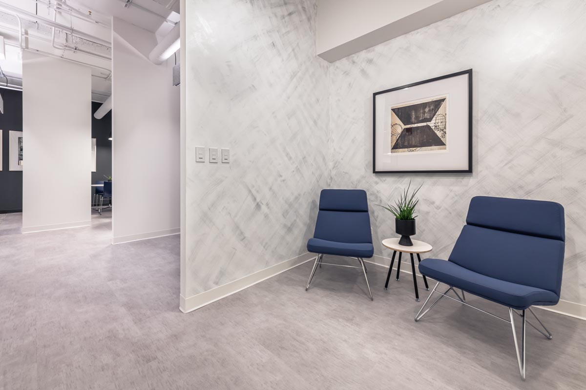 Newly renovated and fully furnished, Interwork recently completed two spec suites at Continental Towers in Rolling Meadows. The renovation was focused on providing an open loft like space with open to deck ceilings, bringing in more natural light. Modern neutrals and warm wood tones mixed with matte black accents provide these suites with a fresh and adaptable backdrop for any company to move into.