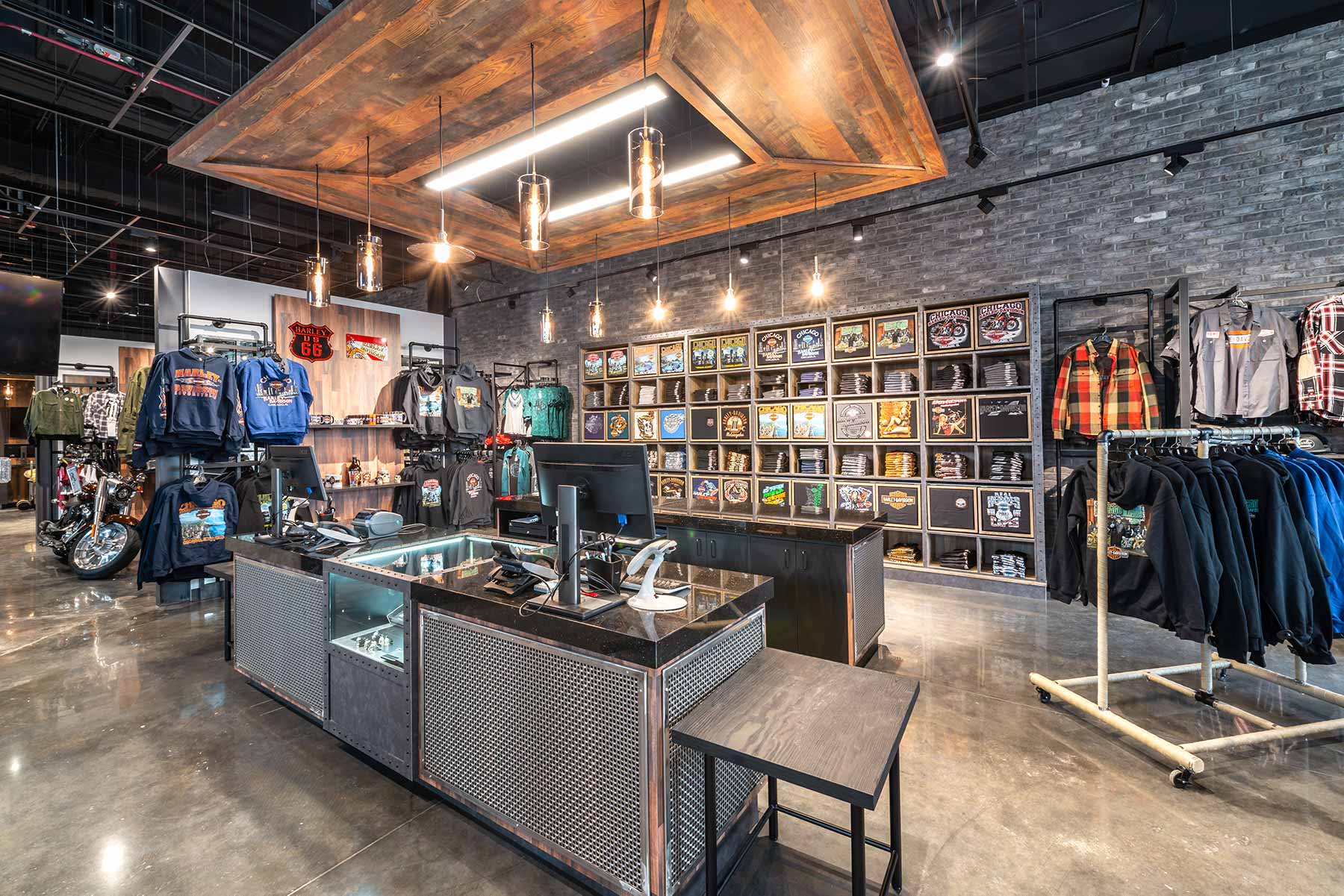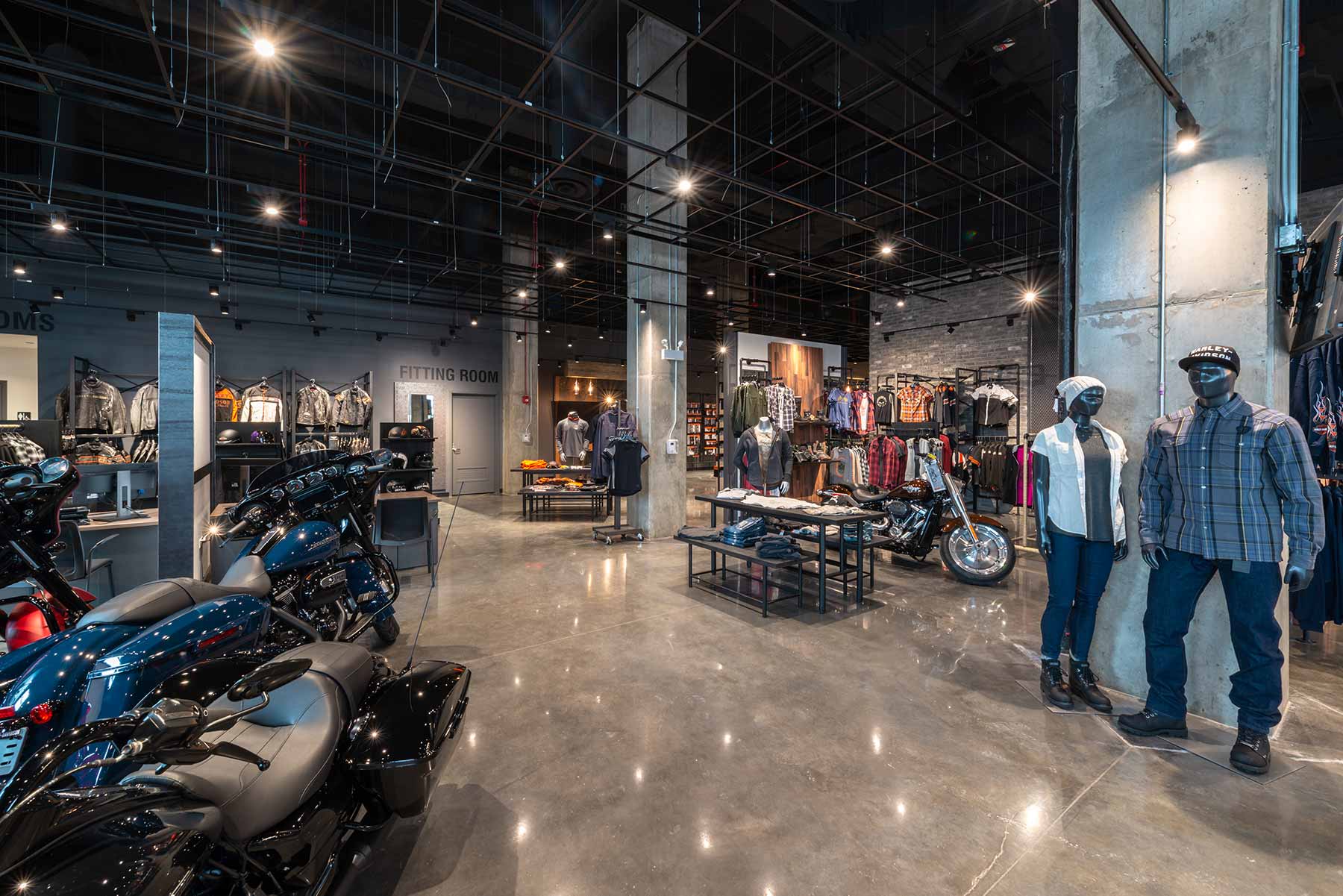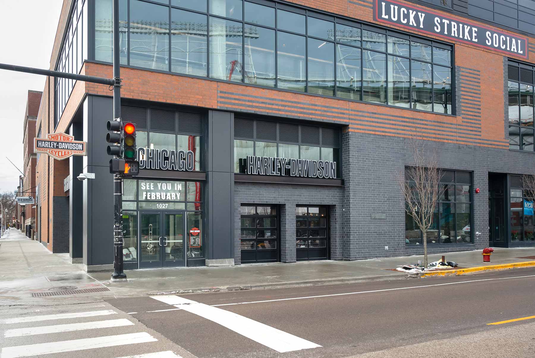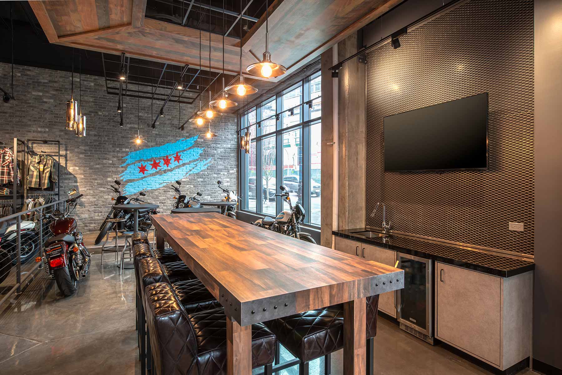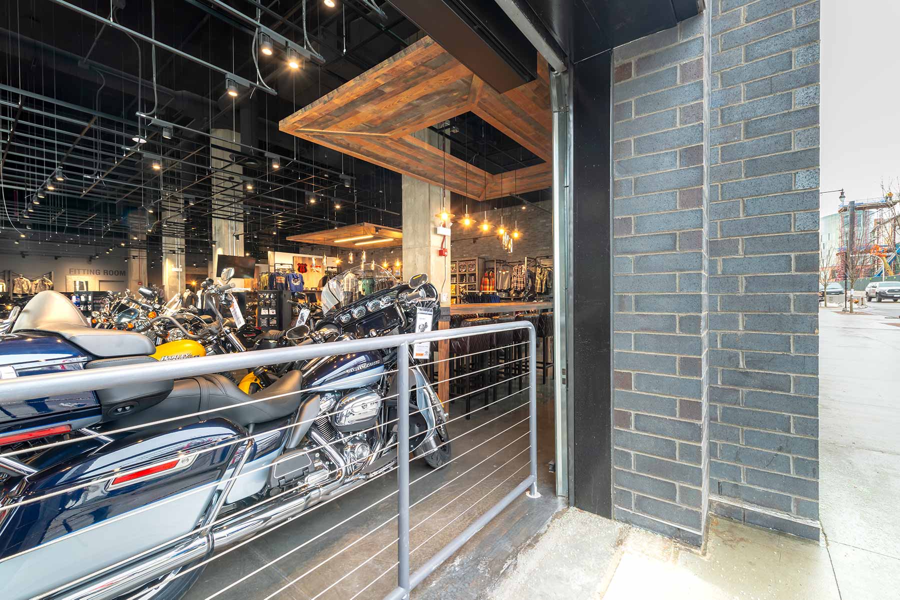 Facing Addison Street are two glass garage doors that will be raised during nice weather and during Cubs games to let the ‘blat-blat’ of a large displacement Harley V-Twin engine from the live VR Experience Ride echo throughout Wrigleyville encouraging foot traffic to enter the store and admire the hardware and maybe pick up some Harley branded merchandise.