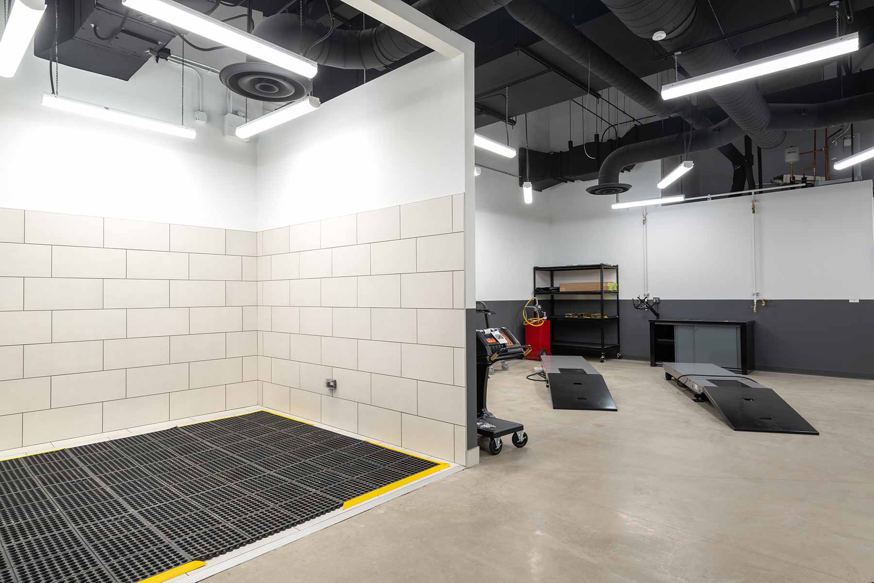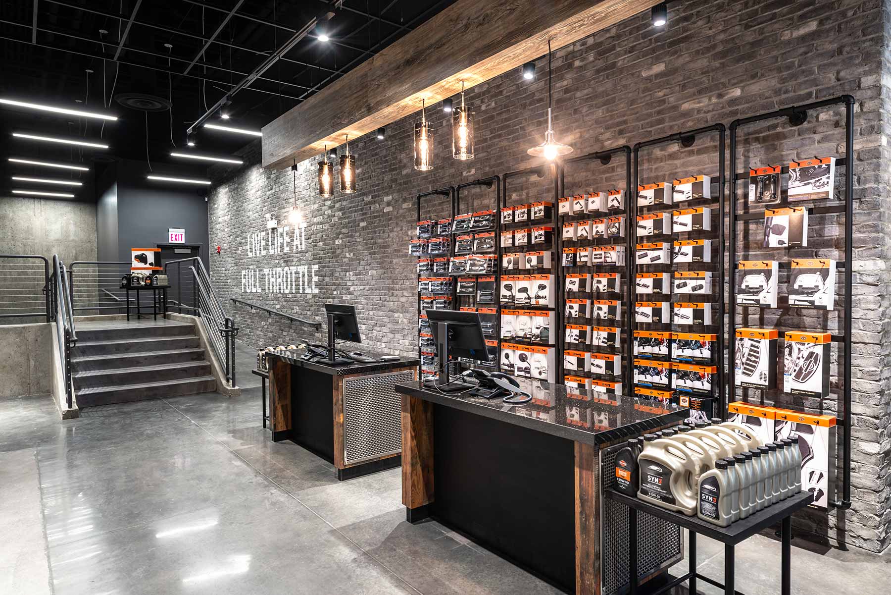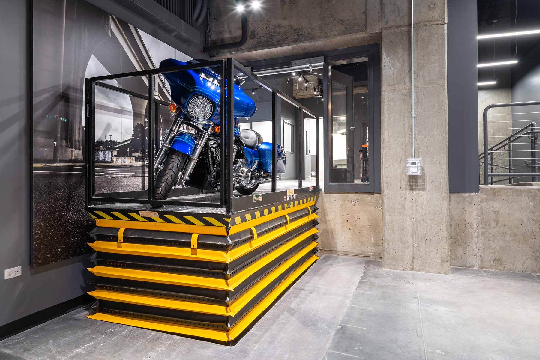 For what was intended to be a single-story space this site condition created quite a challenge as the area allotted for vertical circulation was limited. Interwork was able to fit a monument stair and ~30 feet of handicap ramp between the showroom and service area in such a way to minimize the disturbance to the store’s merchandise layout. In order to keep the neighborhood happy by not having transfer motorcycles around the alley a transfer lift was added inside the suite to allow purchased motorcycles to be moved and prepped in the service area without having to ride them through the front doors through the neighborhood.