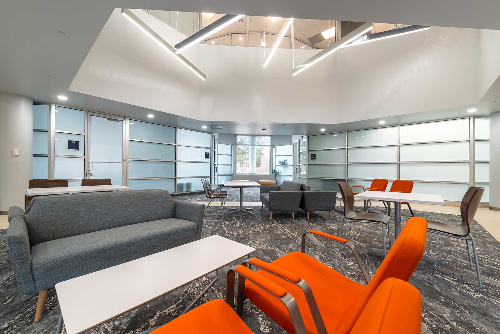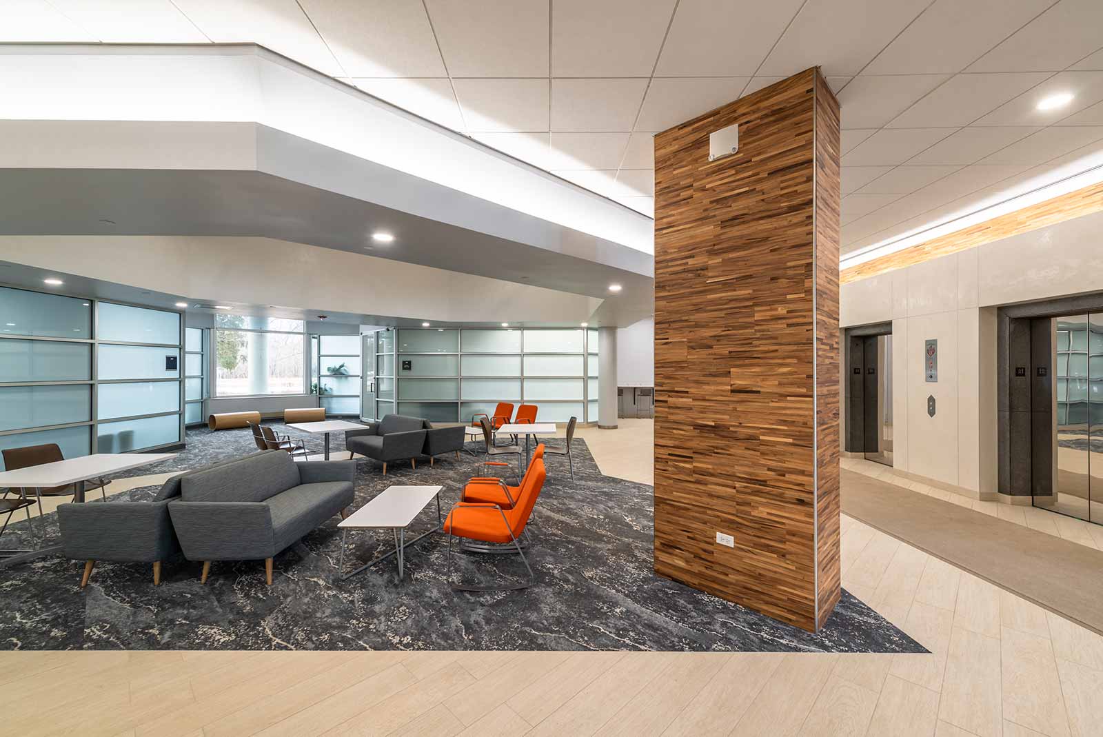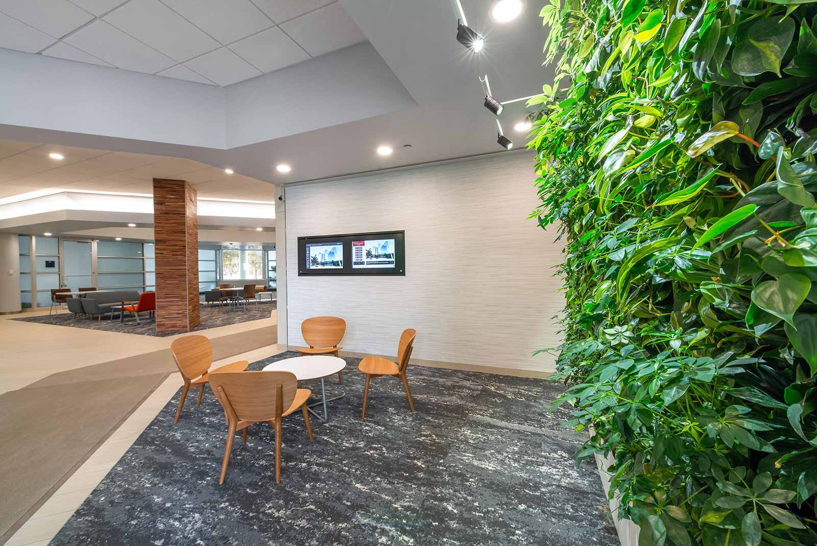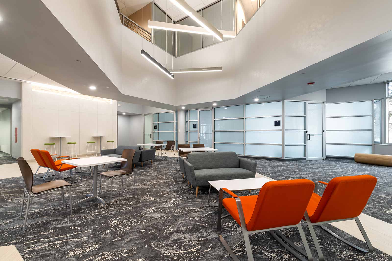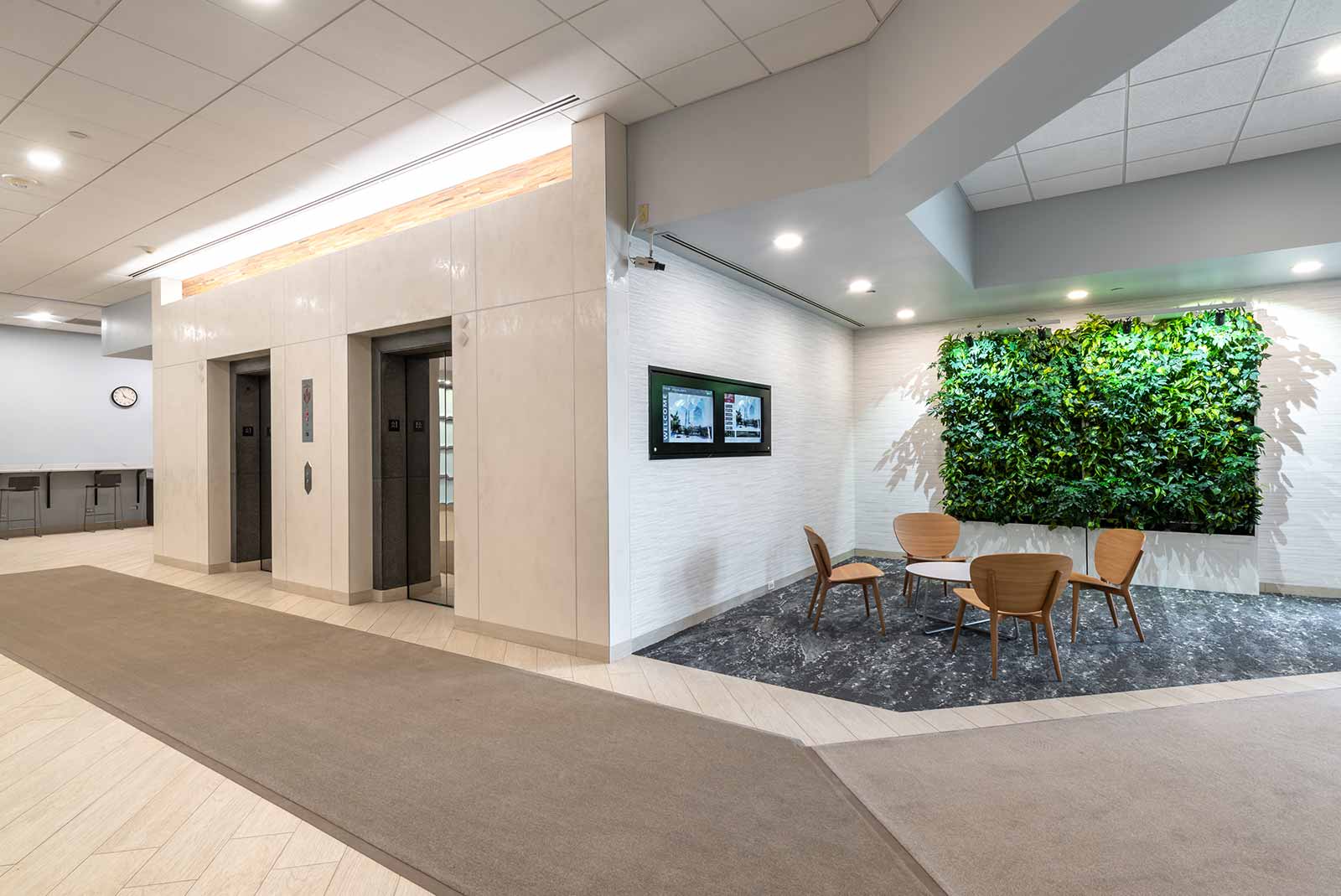 Interwork recently refreshed and updated common lobby spaces totaling 4,450 square feet. A dated open lobby including the entry and atrium seating lounge as well as deli café were opened up and modernized with bright and inviting finishes. A portion of vacant office space located adjacent to the atrium seating was also converted to a building conference center.