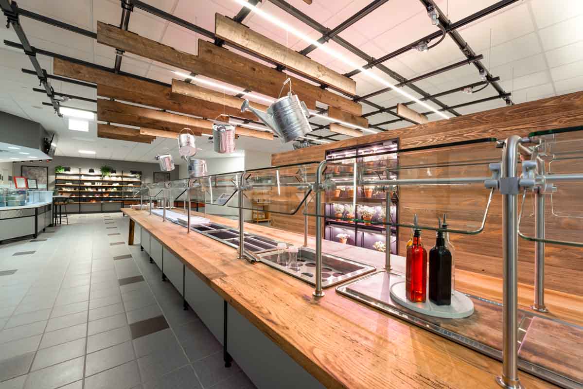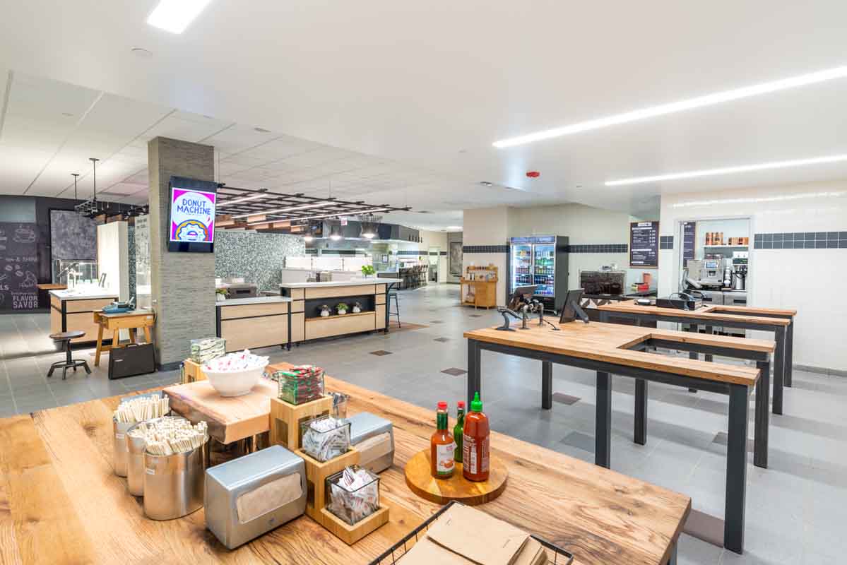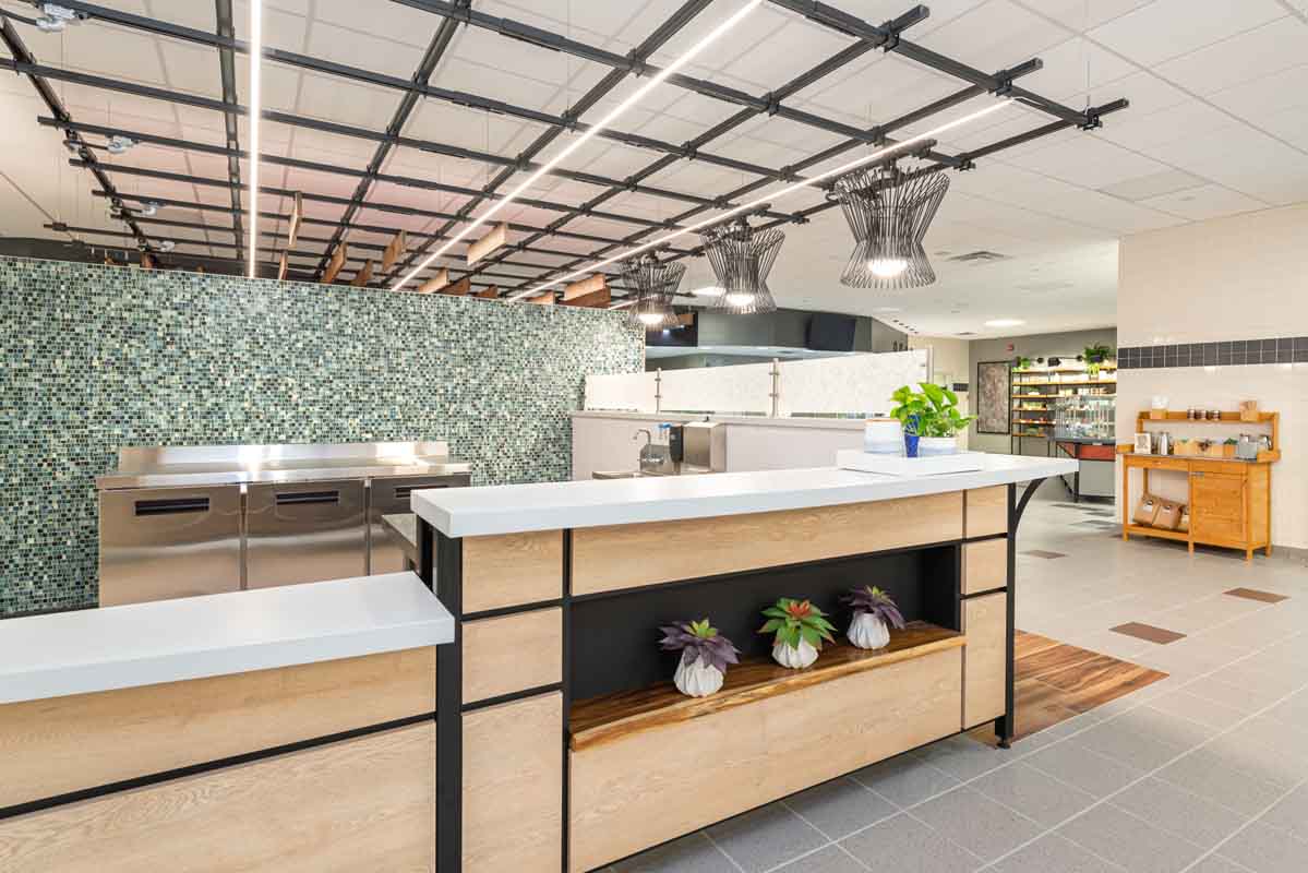 BECO Midwest purchased a nearly 1 million square foot former corporate headquarters in Libertyville, IL and repurposed it into a multi-tenant office building, Innovation Park. They were looking to provide lifestyle amenities that would help achieve a Tech-type campus. For this amenity area, a remodel of the existing food service space, BECO selected Food For Thought as their operator and Interwork Architects to design the space. Working closely with Food For Thought on the development of their initial “innovative” concepts for a “food hall” style conversion of the former corporate cafeteria space, Interwork designed a series of food stations, each incorporating its own style and theme, while working together to fit the overall character of the ‘i-Bistro’.