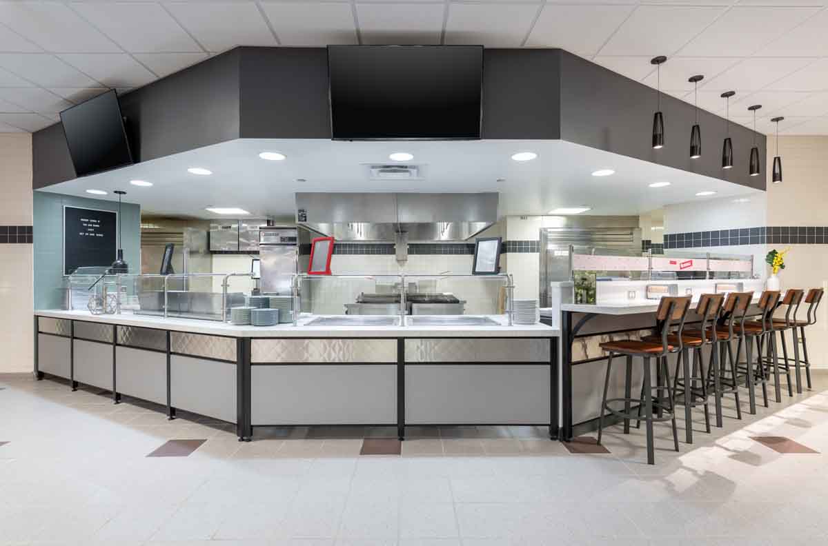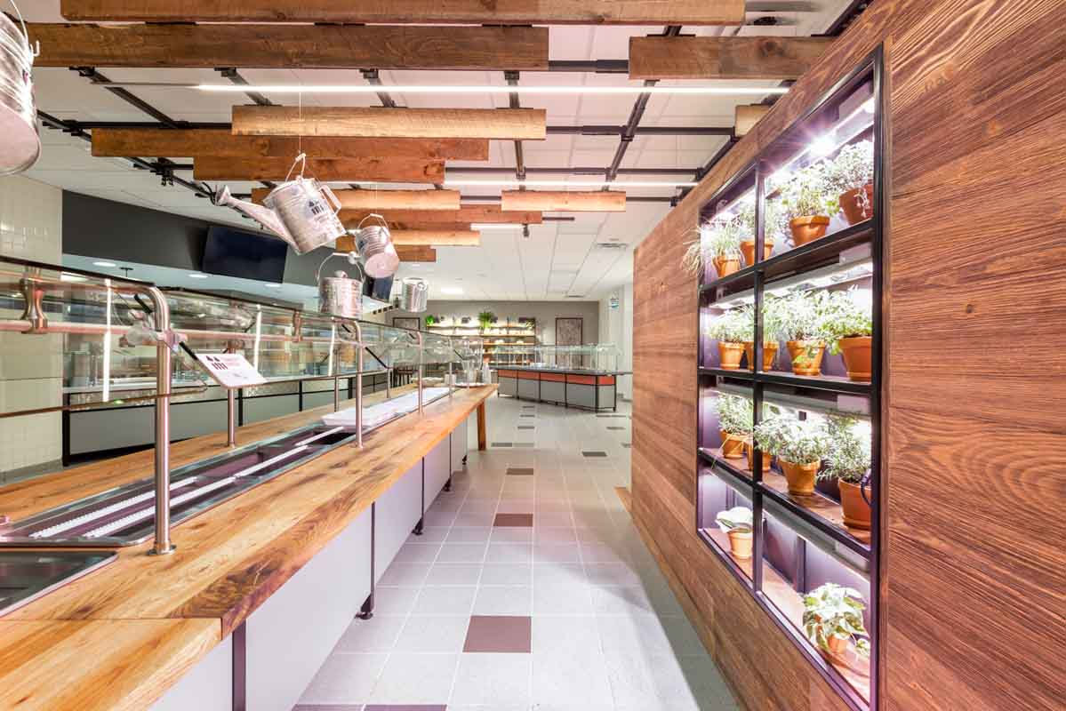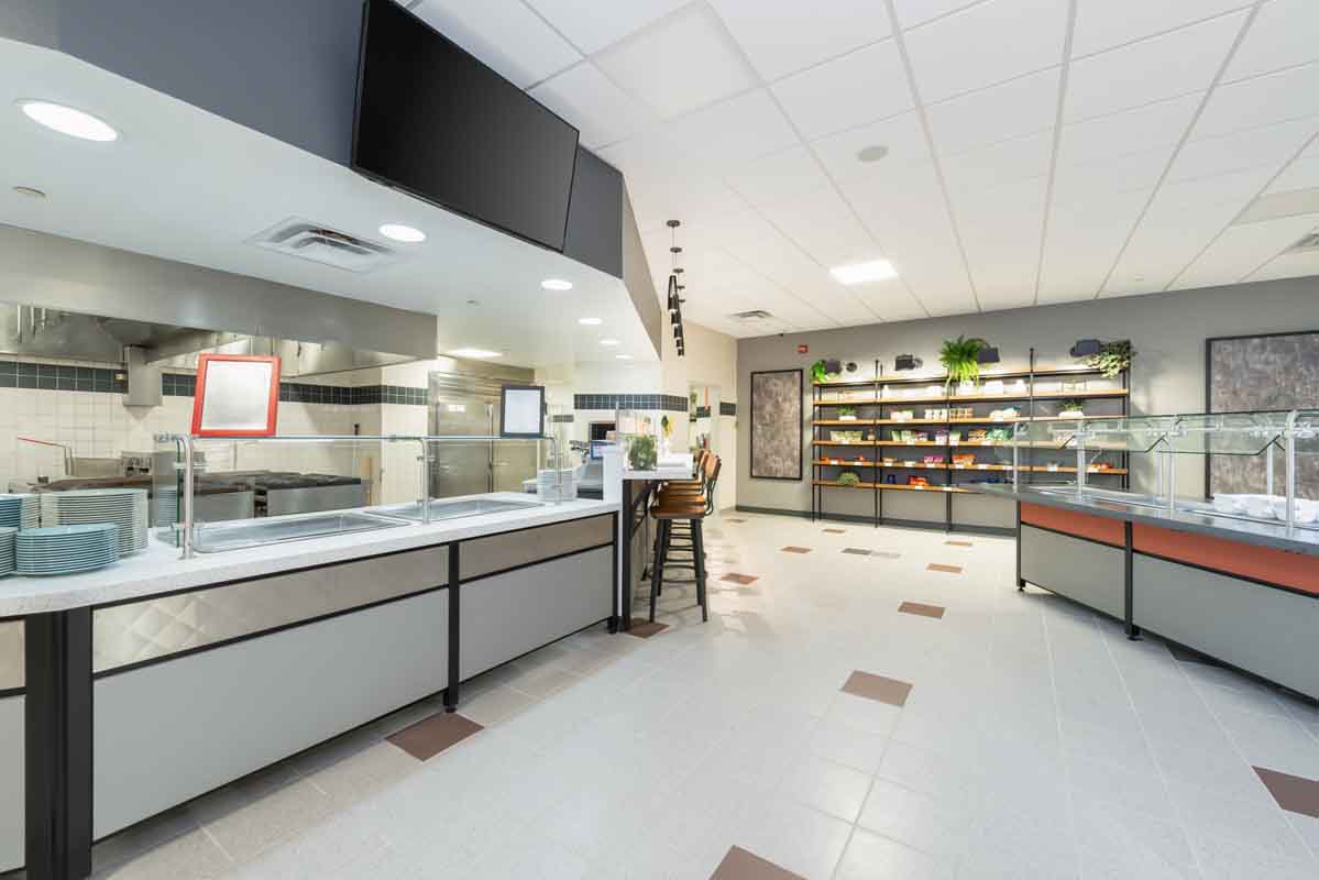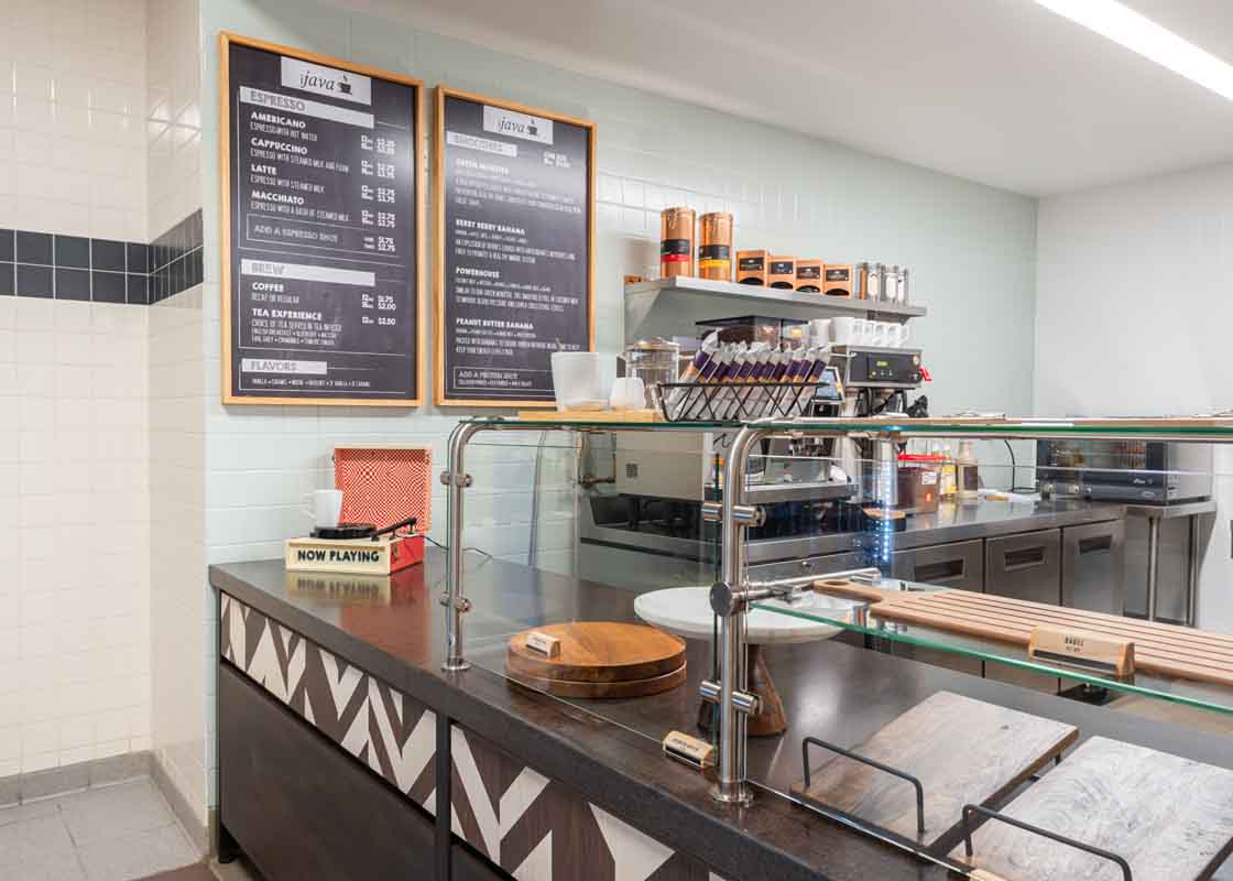 BECO Midwest purchased a nearly 1 million square foot former corporate headquarters in Libertyville, IL and repurposed it into a multi-tenant office building, Innovation Park. They were looking to provide lifestyle amenities that would help achieve a Tech-type campus. For this amenity area, a remodel of the existing food service space, BECO selected Food For Thought as their operator and Interwork Architects to design the space. Working closely with Food For Thought on the development of their initial “innovative” concepts for a “food hall” style conversion of the former corporate cafeteria space, Interwork designed a series of food stations, each incorporating its own style and theme, while working together to fit the overall character of the ‘i-Bistro’.