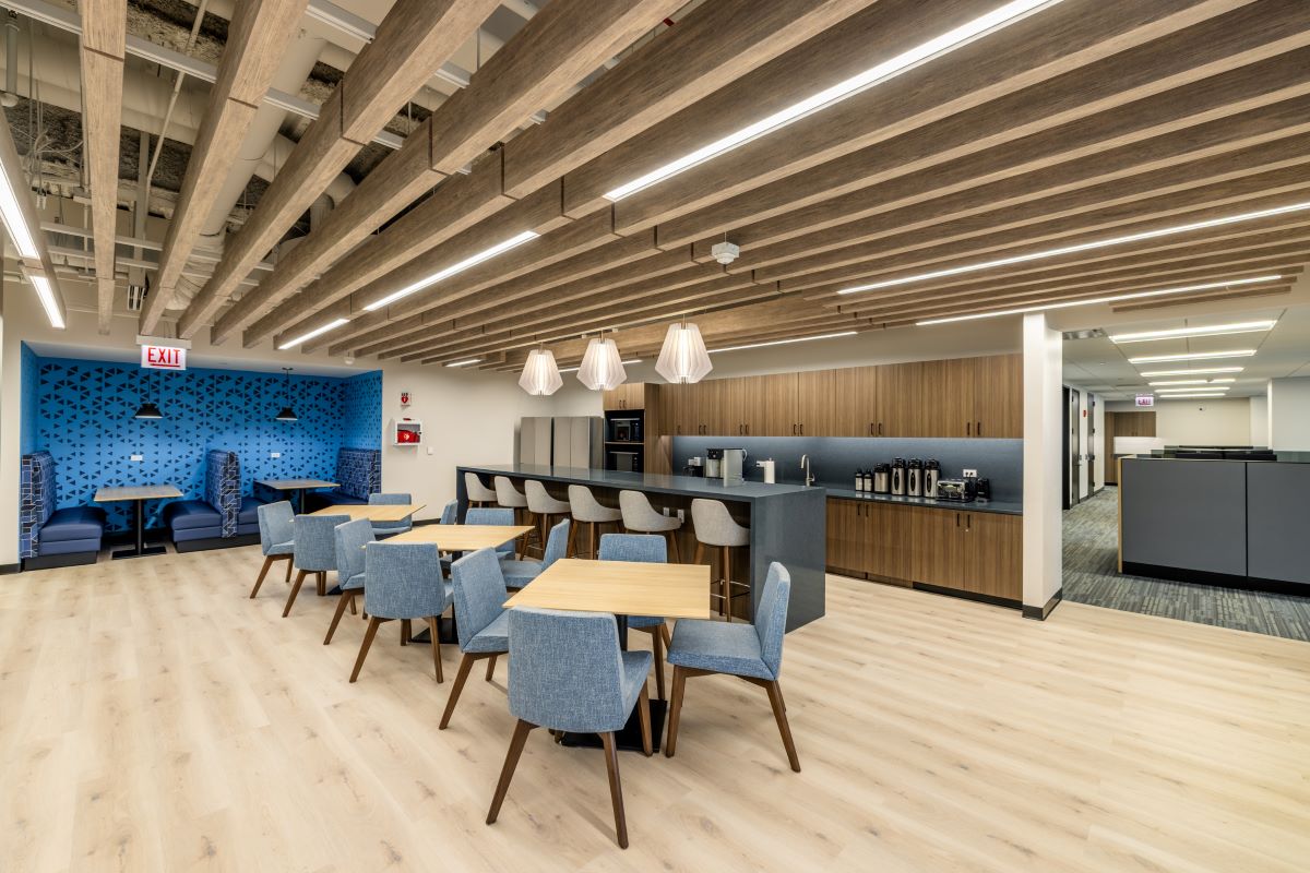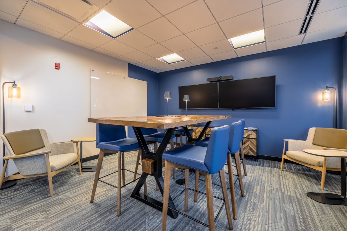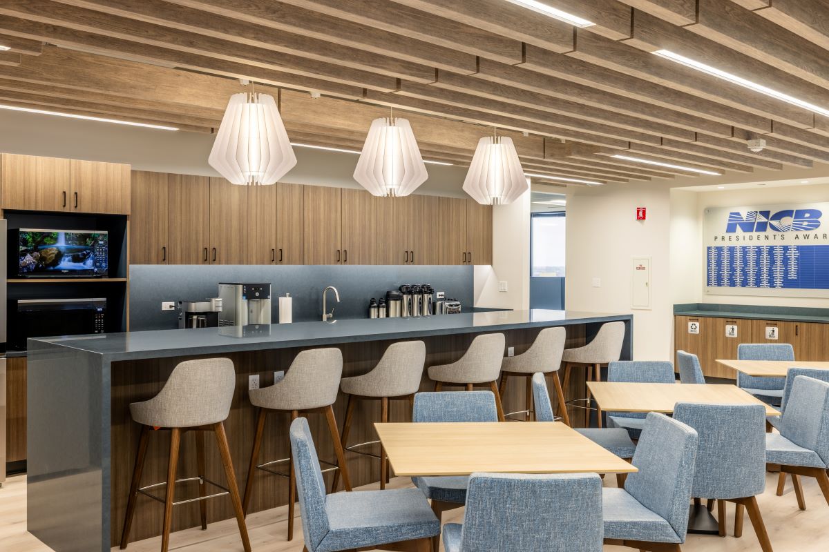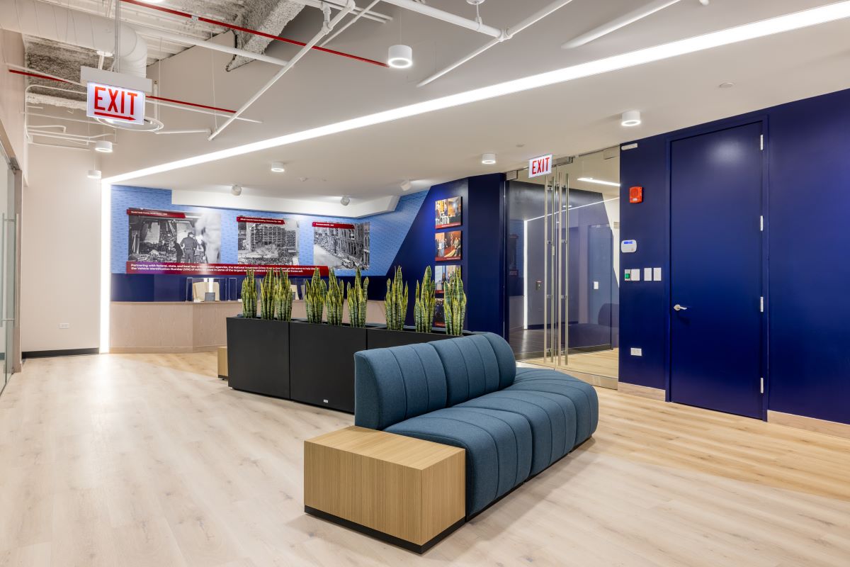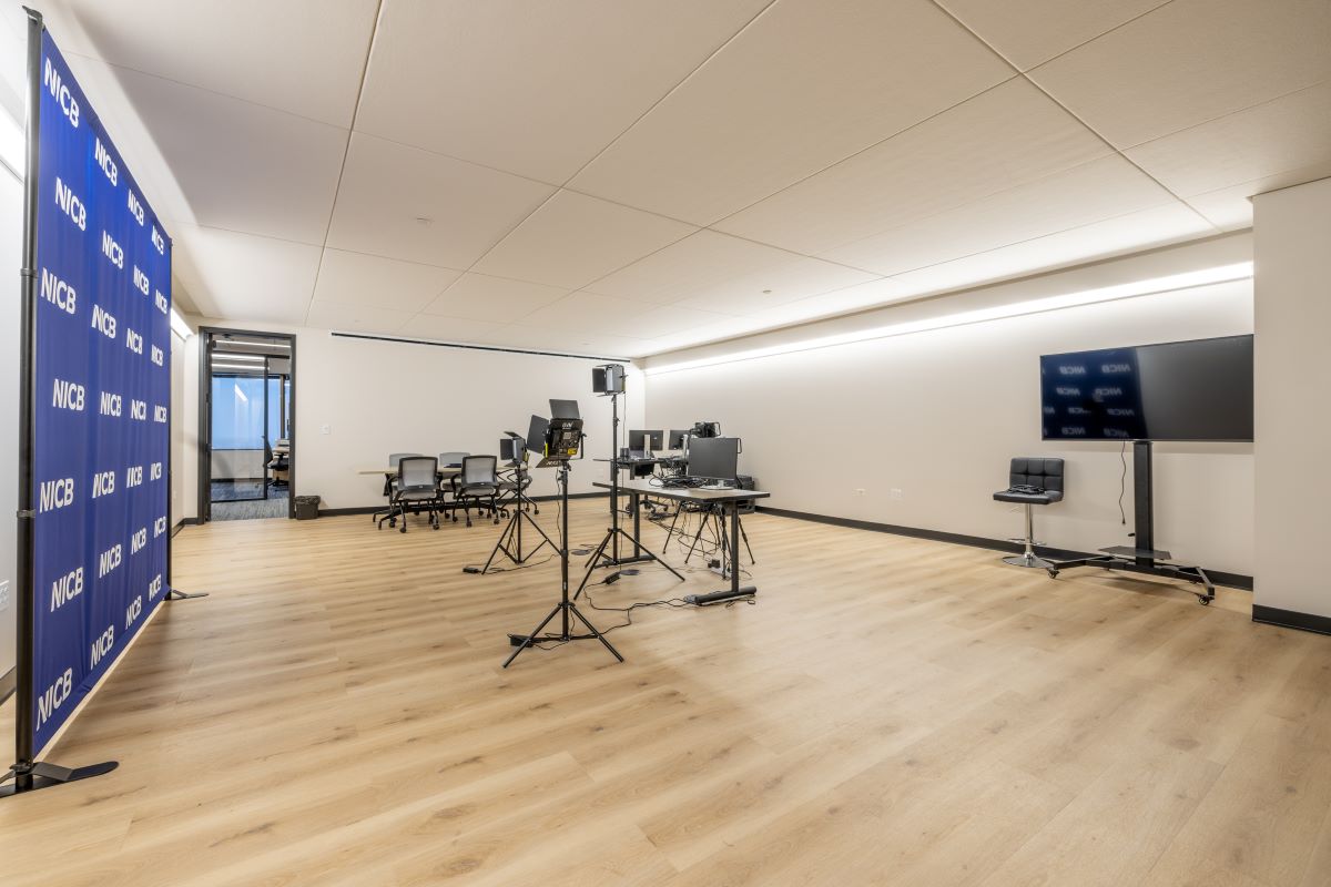 Not yet sure where they wanted to be or exactly what their program looked like, the National Insurance Crime Bureau partnered with Interwork to relocate their office. Post pandemic remote work culture has provided NICB with the opportunity to source the best talent across the country, altering their need for daily office space but creating a greater need for dynamic and impactful environments when full teams do gather together in person. Beginning with program development and initial site tours, Interwork provided test fits for each building to assist in visualizing what each space could offer their team. IWA worked closely with NICB to ensure every aspect of the design supported their vision for work and company culture. In addition to traditional office and workstation areas, this suite includes a history wall displaying archival documents, a large break room for event receptions & large team meetings, and a broadcast studio.