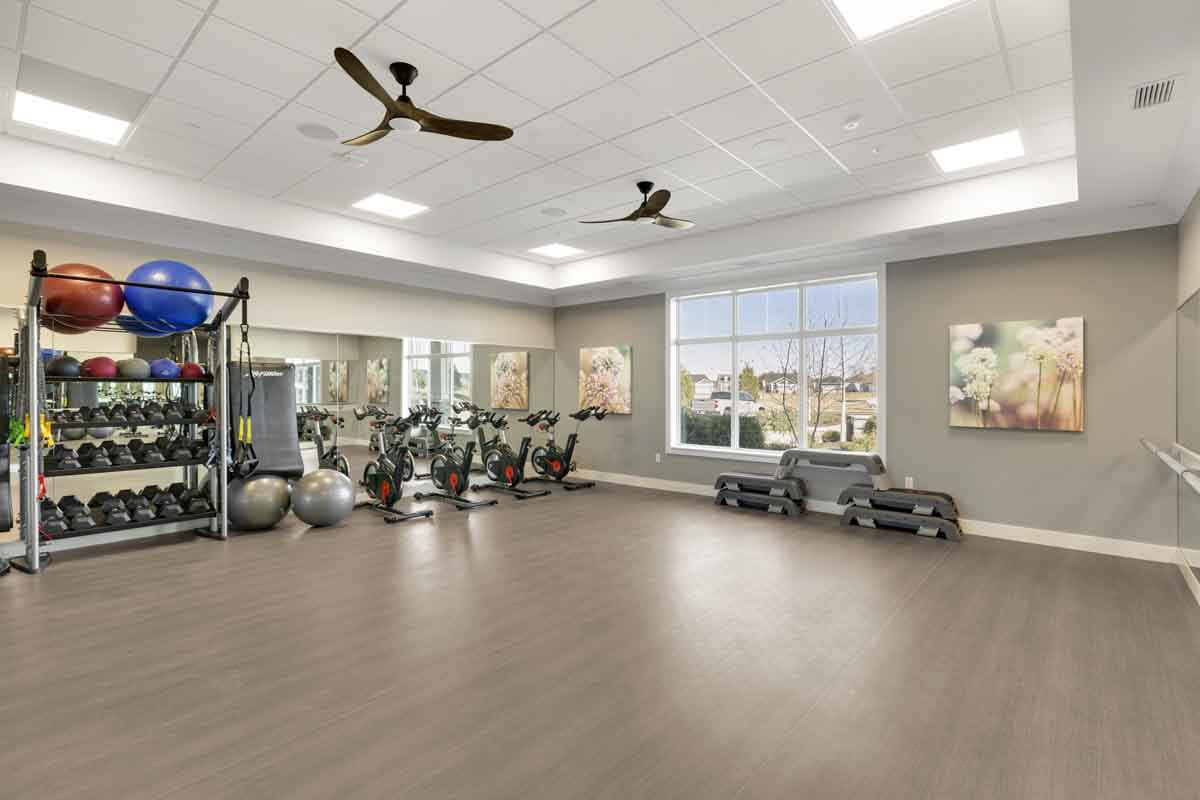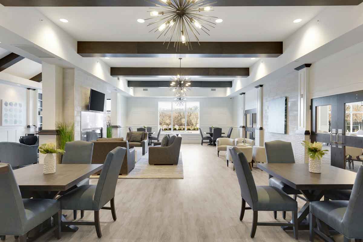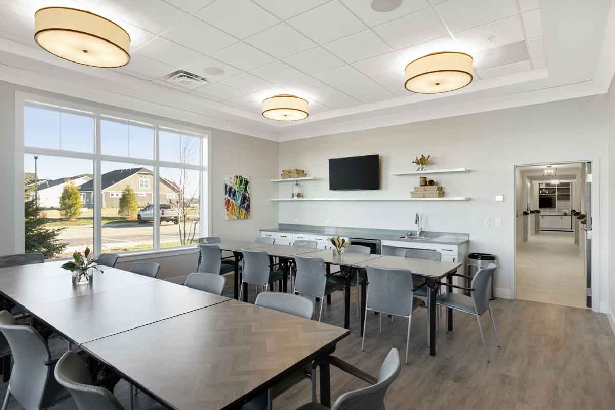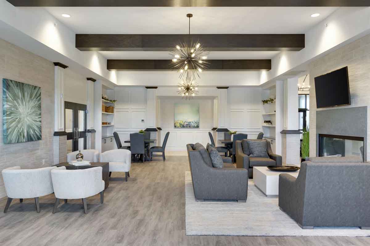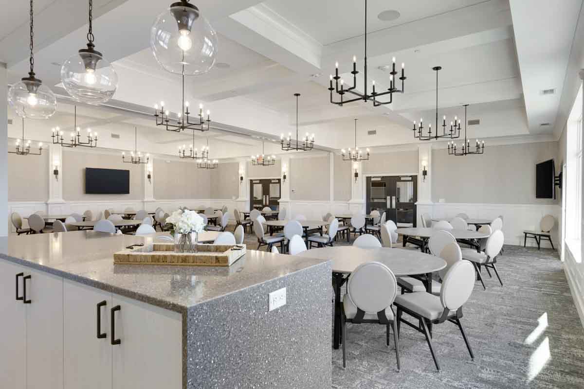 This elegant 55 and over active adult community clubhouse houses multiple amenities for the active lifestyle including a pool, fitness center, multiple multi-use spaces, and a kitchen.