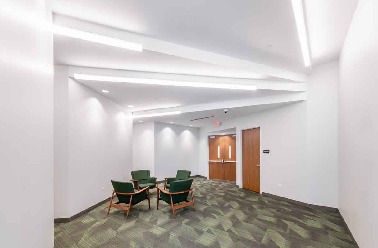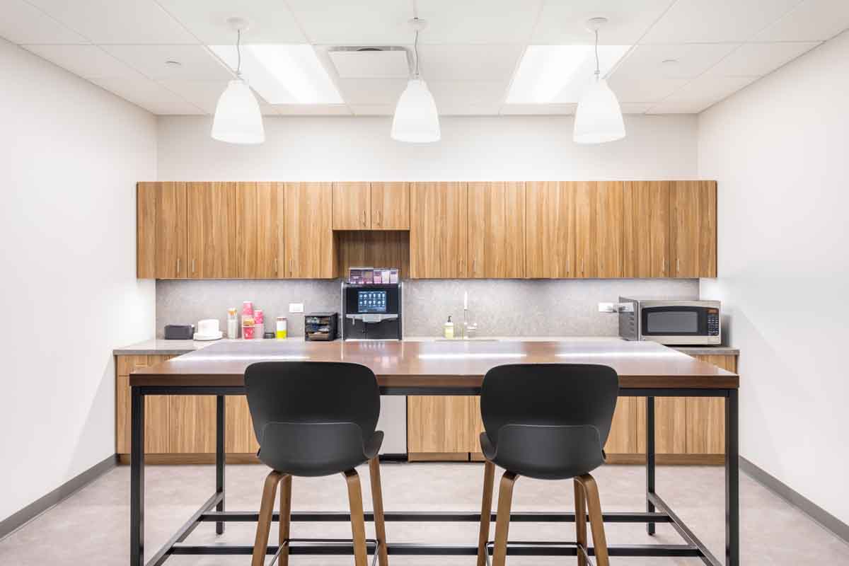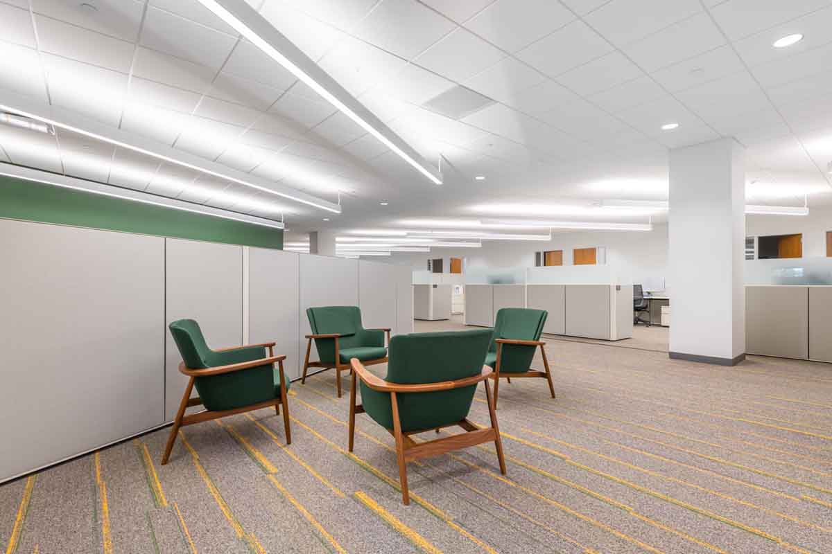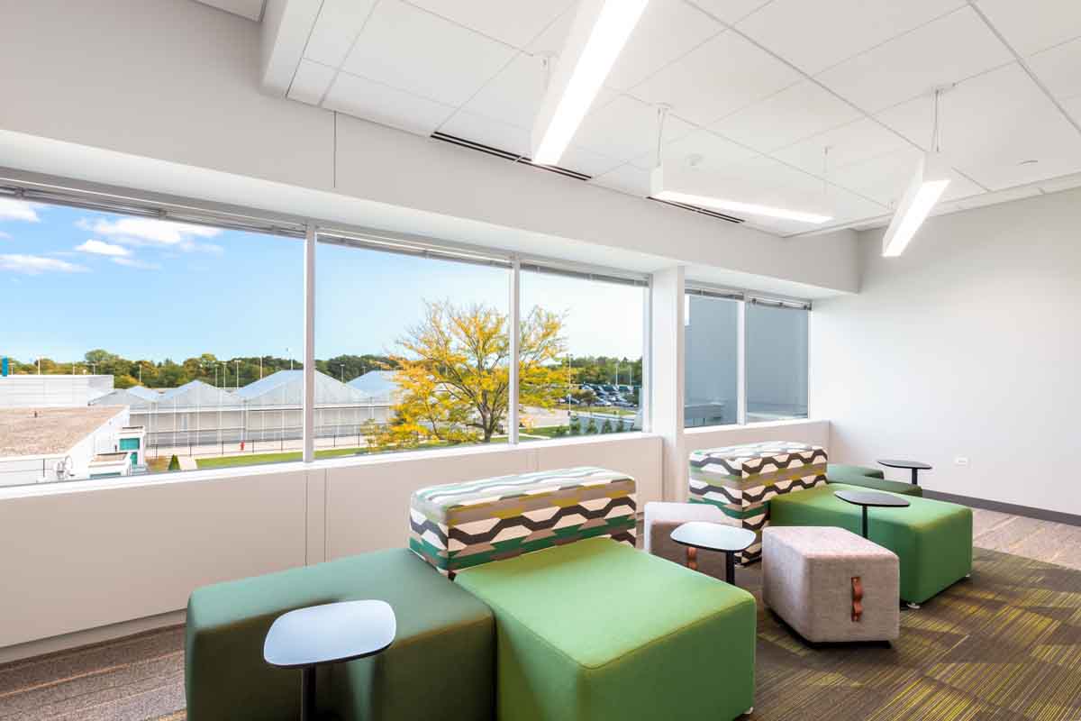 Valent was looking to create a dynamic and collaborative space when relocating their global headquarters. The new office location is a 30,000 SF suite directly above their recently completed lab and greenhouse space in the BECO Innovation Park campus. It was important that we create a seamless transition between the existing space and the new while also taking in to account the difference in work style and productivity requirements of the departments occupying this second-floor space. Diverse work spaces were planned throughout the space in order to support the various ways Valent’s groups collaborate, ranging from independent work to informal break-out sessions to meetings for 20+. Modular furniture was incorporated throughout to facilitate flexibility and encourage users to modify the work area to best suit their needs. Use of diagonals in the space create an energizing environment while also emphasizing the window line and greenhouses below.